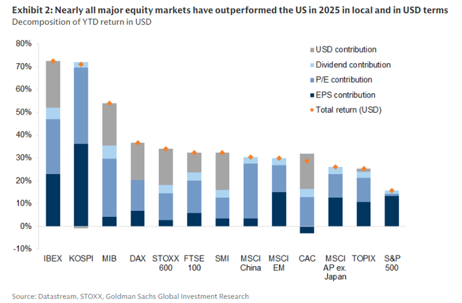 For many international investors, returns in 2025 were lower than expected. Despite strong performances in sectors such as technology and defense, there was one dominant factor that depressed total returns (in euros): the sharp depreciation of the US dollar by approximately 12% against the euro. While an ETF on the S&P 500 achieved a return of approximately +17% from a US perspective, this investment only yielded approximately +5% on a euro account. For similar reasons, the MSCI World stock index (approximately 8% in euros) also lagged significantly behind the European stock indices.