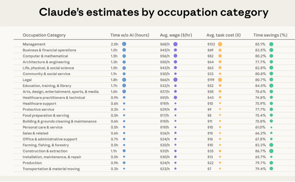 The study shows that AI drastically speeds up the performance of many tasks, saving up to 80% of the time on average, across a wide range of professions. The greatest efficiency gains are achieved in complex cognitive tasks, such as analysis, planning, writing, and problem solving. It is precisely in areas where human time is traditionally scarce and expensive that AI appears to add the most economic value. If these effects continue to spread widely, AI could significantly accelerate labor productivity growth in the coming years, possibly to about twice the pace of the past decade.