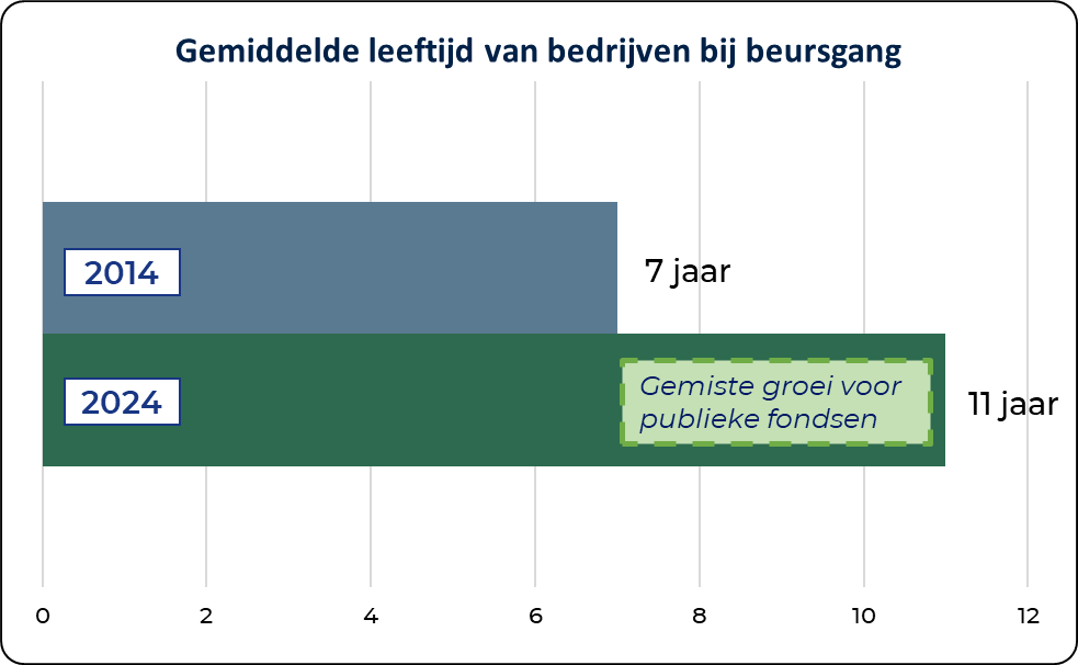 A third crucial argument is the structural shift in which companies are delaying their initial public offerings for increasingly longer periods. Because private markets have matured and vast amounts of capital are available for large deals, the need to turn to the public market for financing has diminished. For the index investor, this has major implications, as it means that a company’s most explosive growth phase increasingly takes place entirely outside the view of the public stock market.