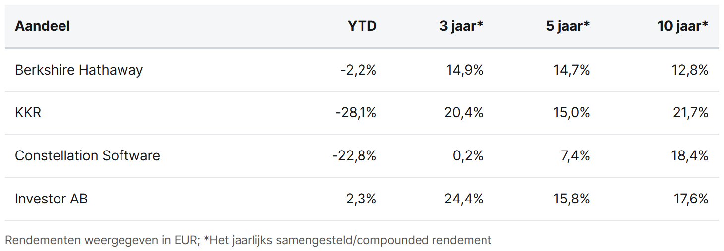 Berkshire Hathaway, KKR, Constellation Software, and Investor AB are currently trading on the New York, Toronto, and Stockholm stock exchanges at prices of USD 483.57 (Class B shares), USD 89.90, CAD 2,509.57, and SEK 338.00 per share, respectively.