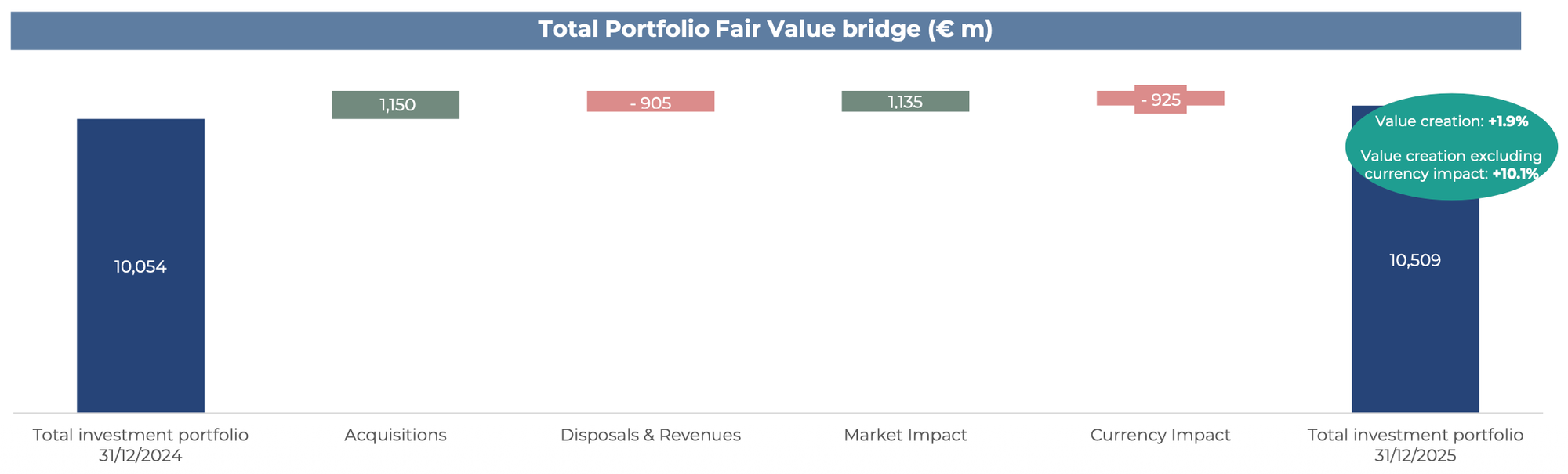 Sofina invested slightly more (in acquisitions) than it recovered in capital (from sales and capital distributions from funds). What stands out in the chart is the approximately 10% increase in the portfolio’s value. "Market impact" reflects this underlying increase in value. However, this is almost entirely offset by the impact of exchange rates, resulting in actual value creation of only 1.9%.