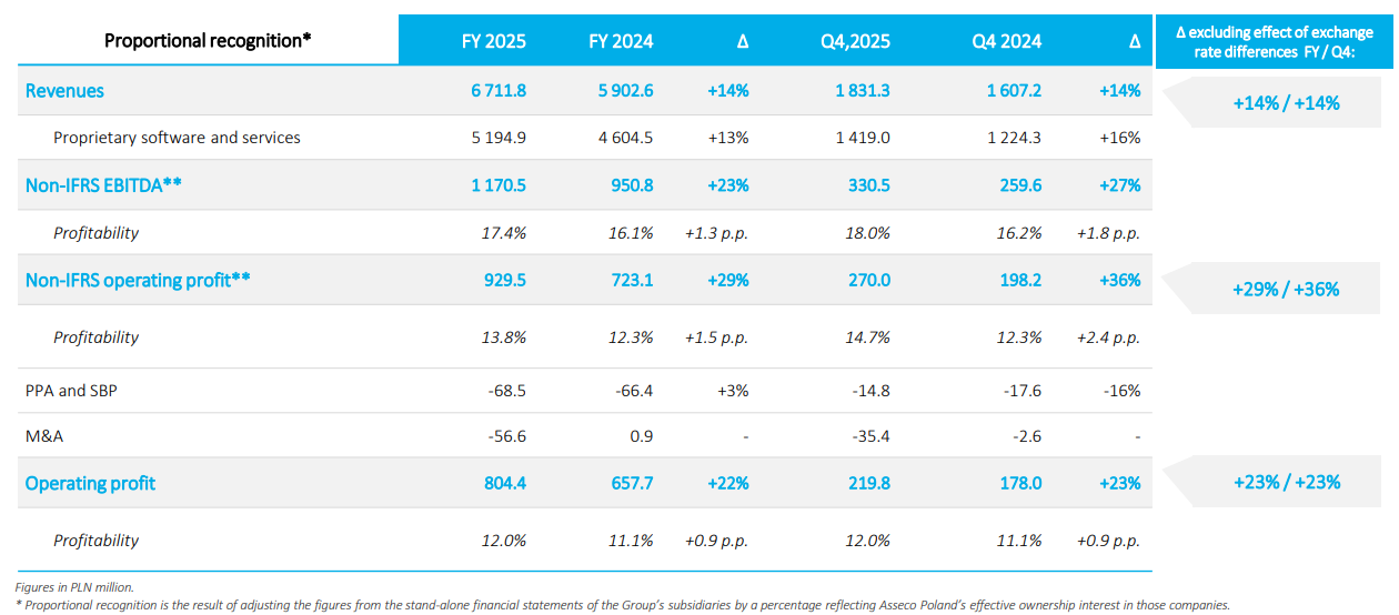 For investors in Asseco Poland, the consolidated figures are only partially relevant. Because the company has significant minority interests, particularly through Formula Systems, the consolidated results paint a distorted picture. Therefore, anyone who wants to see Asseco’s true value must look at the pro forma results. These show exactly what portion of the profit and revenue belongs to the holding company’s shareholders.