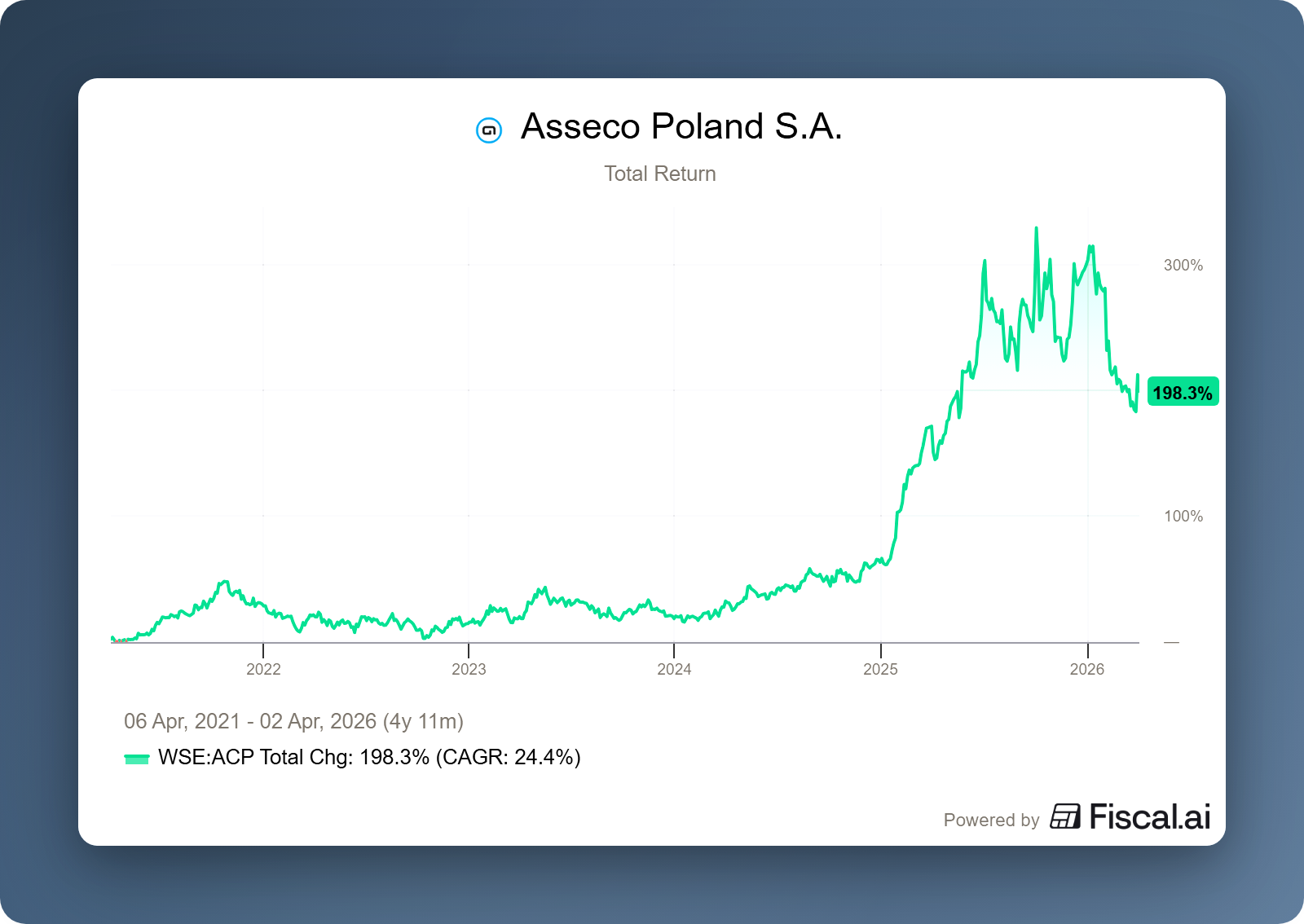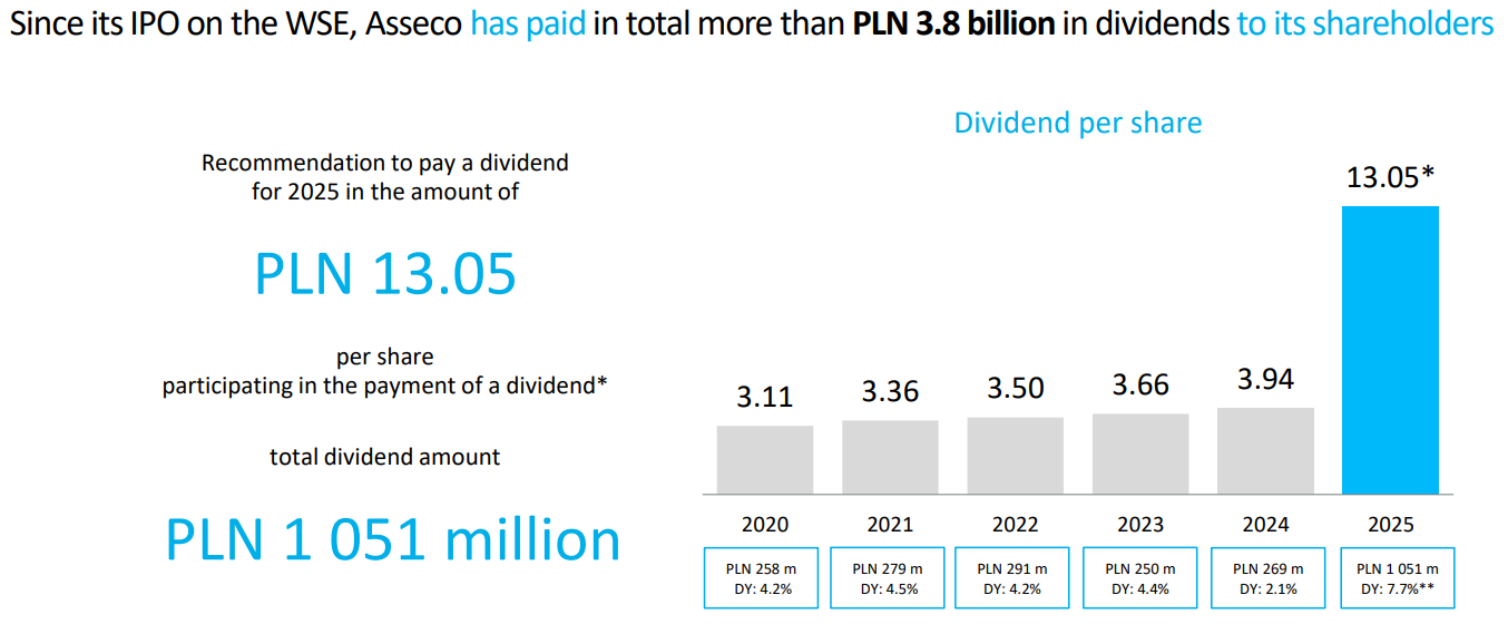 For Topicus, which holds a stake of approximately 25% in Asseco, this proposal represents a significant cash inflow. Since they made their investment at a purchase price of PLN 85 per share, this single dividend will immediately return more than 15% of their original investment.