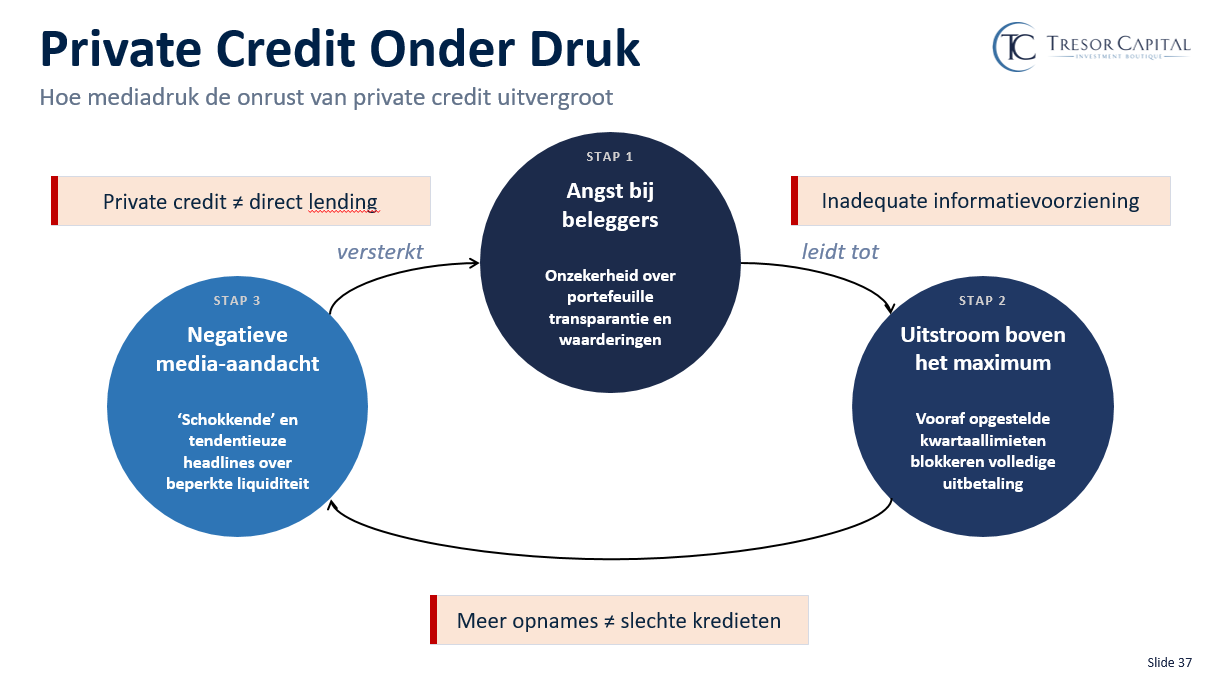 What we are currently seeing in the market is a self-perpetuating cycle of fear. As the attached image illustrates, a harmful dynamic is emerging: uncertainty about valuations is driving investors en masse toward the exit, causing maximum outflow limits to be immediately reached. As soon as that “door” closes, the media jumps on the story with sensational headlines. In this coverage, terms like private credit and direct lending are often unfairly lumped together. The negative tone also suggests that an increase in drawdowns is synonymous with bad loans, which only further fuels panic among investors. This creates a vicious cycle in which inadequate information and media pressure push the markets unnecessarily deeper into the red.
