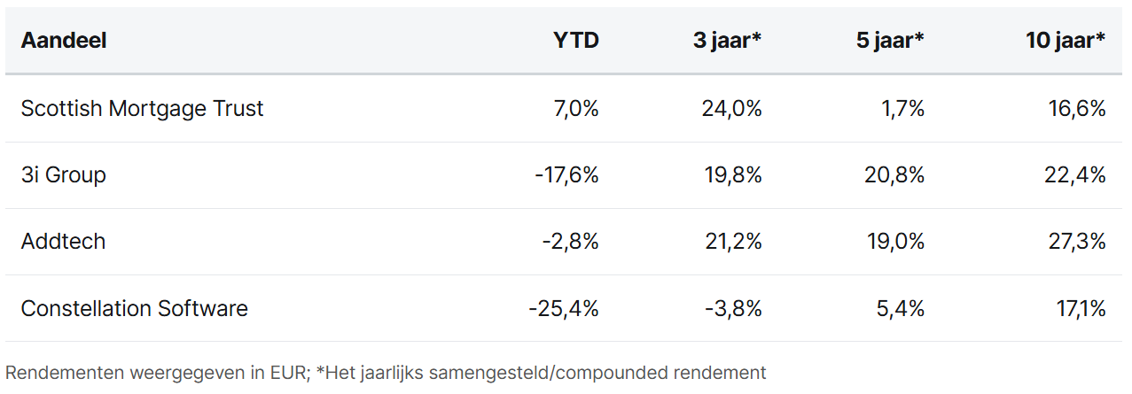Scottish Mortgage Trust, 3i Group, Addtech, and Constellation Software closed the trading week on the London, Stockholm, and Toronto stock exchanges at prices of GBP 12.68, GBP 26.87, SEK 320.60, and CAD 2,441.27 per share, respectively.