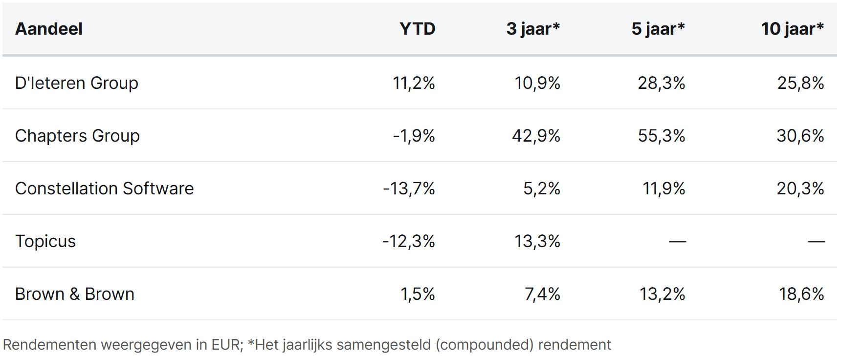 D'Ieteren Group, Chapters Group, Constellation Software, Topicus, and Brown & Brown are currently trading on the Toronto and Brussels stock exchanges at prices of EUR 170.20, EUR 40.70, CAD 2,818.38, CAD 112.77, and USD 79.88 per share, respectively.