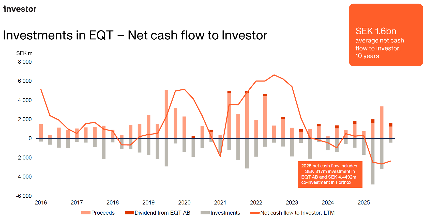 Investor also completed the final tranche of its investment in software company Fortnox during the quarter, bringing the total co-investment to SEK 4.5 billion. During the call, CEO Christian Cederholm explained that this transaction, alongside the EQT X fund, is a way to create value in private markets. When we zoom out to the long term, the picture remains robust with an average annual net cash flow of SEK 1.6 billion over the past ten years. Although cash flow over the last twelve months was negative due to significant investments in EQT shares and Fortnox, it would have been positive without these strategic moves.