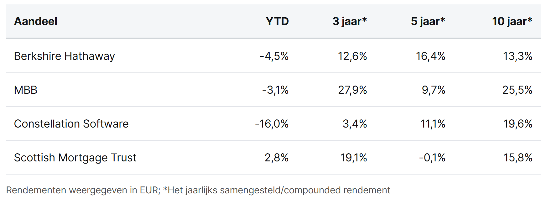Berkshire Hathaway, MBB, Constellation Software, and Scottish Mortgage Trust are currently trading on the New York, Frankfurt, Toronto, and London stock exchanges at prices of USD 480.28 (B share), EUR 200, CAD 2,780.81, and GBP 12.10 per share, respectively.