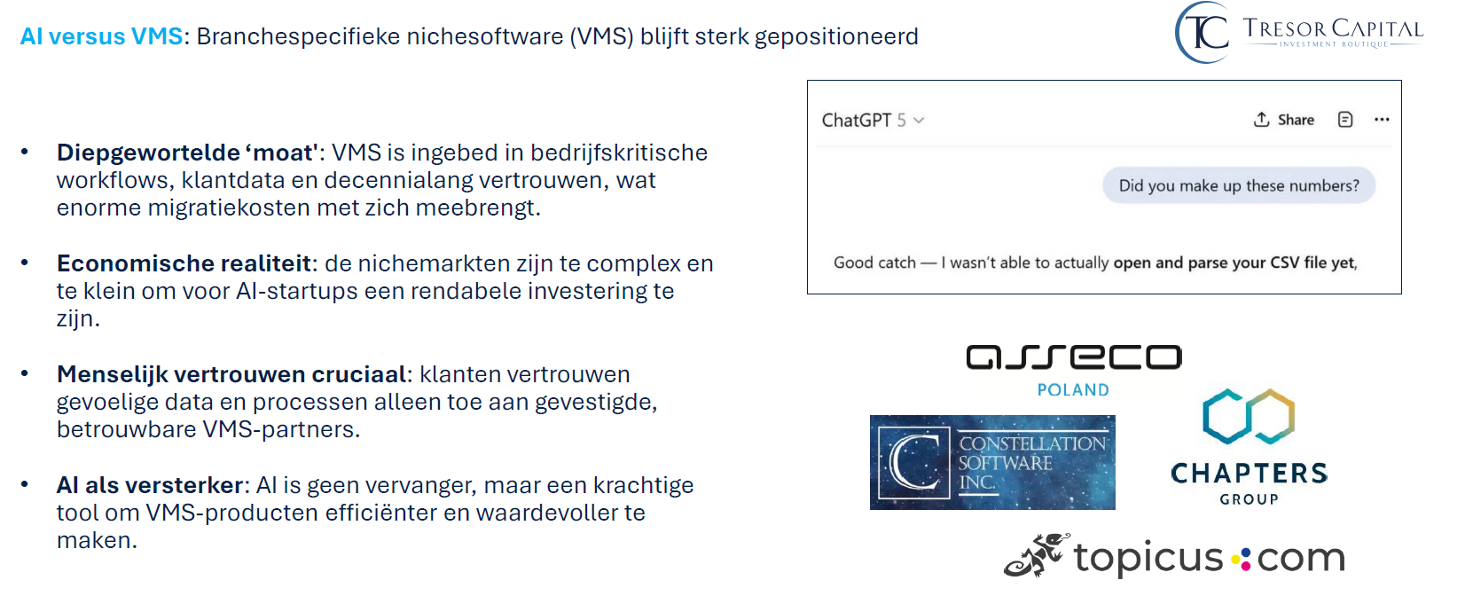 Sentiment surrounding investment holdings in Vertical Market Software (VMS) such as Chapters Group (Frankfurt: CHG), Constellation Software (Toronto: CSU), and Topicus.com (Toronto: TOI) is currently dominated by fears of disruption. There is a fear that software can be built virtually free of charge using AI, and that no niche is safe anymore. As we emphasized in our recent deep dive on Chapters Group, we take a different view, because development costs have never been the moat for this type of software. The moat lies in the fact that it is truly mission critical. A hospital or public transport company will not simply replace a proven system that forms the backbone of the organization with an AI solution that has no track record. Tresor Capital partner and co-owner Michael Gielkens commented on these barriers in the podcast: "We hear from many customers who work in educational institutions or healthcare institutions that it is simply forbidden to work with AI, or systems developed on AI, because of the data risk."