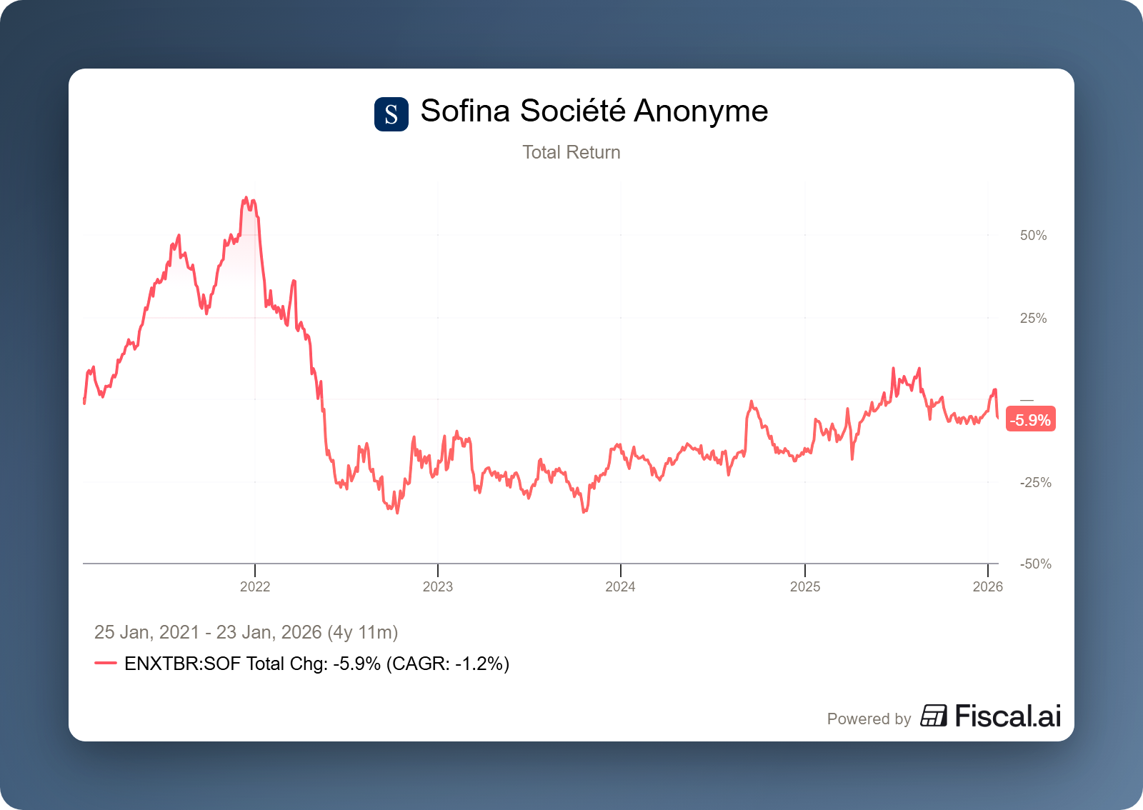 In October 2025, Sofina carried out a capital increase, issuing new shares at a discount. This issue has a dilutive effect on the NAV per share. Adjusted for this share issue, the NAV per share would have been approximately €305. This implies a decline of approximately 2% compared to €312 per share at the end of 2024 (and an increase of approximately 3% in the second half of the year), a movement that, according to management, can largely be explained by currency effects and not by a deterioration in the underlying portfolio.