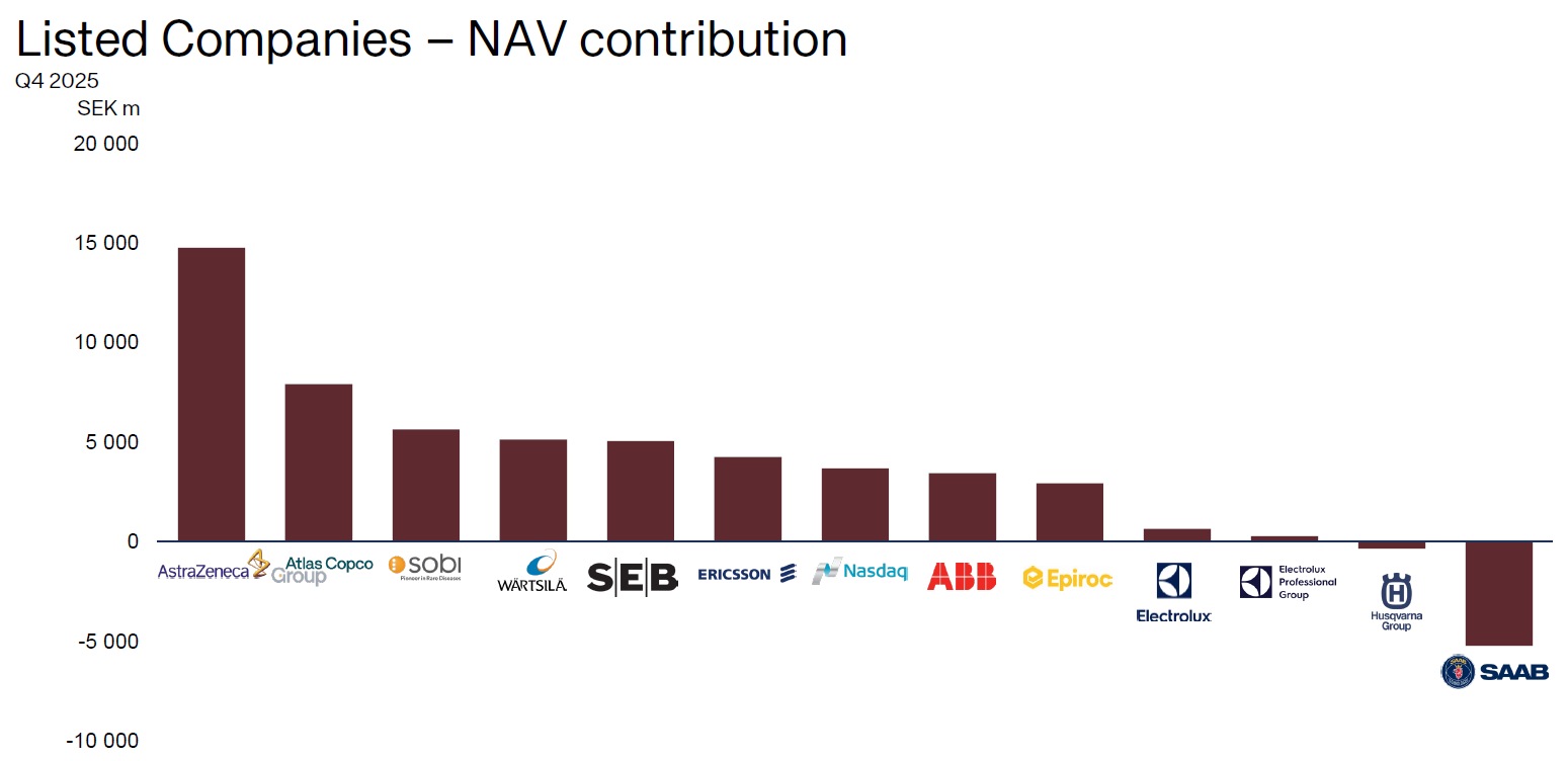 's listed companies Investor AB's listed portfolio made a solid contribution to the growth of net asset value in the fourth quarter. The figure below shows each company's contribution to NAV development in Q4. Virtually all positions contributed positively, with AstraZeneca, Atlas Copco, Sobi, Wärtsilä, and SEB as the most important value drivers. During the conference call, management emphasized that the total return of the listed portfolio in the quarter was largely in line with the Swedish market at 6 percent, but that absolute value creation was driven by a broad base within the portfolio.