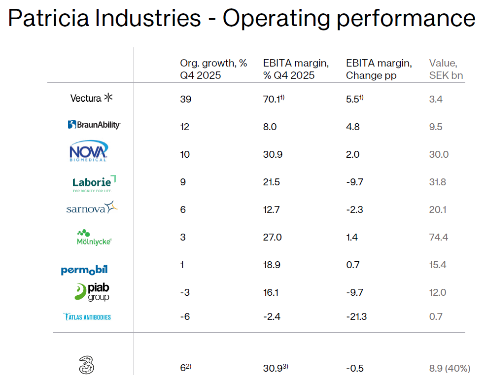 Mölnlycke is by far the largest investment within Patricia Industries and therefore received above-average attention during the conference call in terms of analysts' questions. In Q4, Mölnlycke reported 3% organic growth, driven by the wound care (+5%) and gloves (+3%) divisions, while the EBITDA margin improved further to around 27%, despite ongoing negative currency effects and trade tariffs.