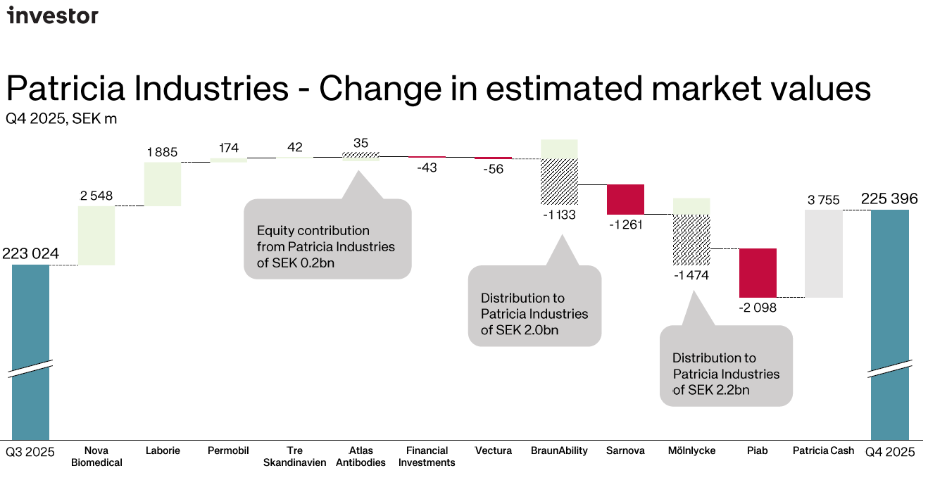 The attached value bridge puts these operational performances into perspective. Despite solid underlying development, Mölnlycke made a negative contribution to estimated market value in Q4, mainly due to currency effects and a dividend payment of €200 million (approximately SEK 2 billion) to Patricia Industries. However, this decline is not unrelated to the fundamental quality of the company. On the contrary: the margin improvement was driven by active efficiency programs and a favorable product mix, which, according to management, offset currency and tariff pressures by several percentage points.