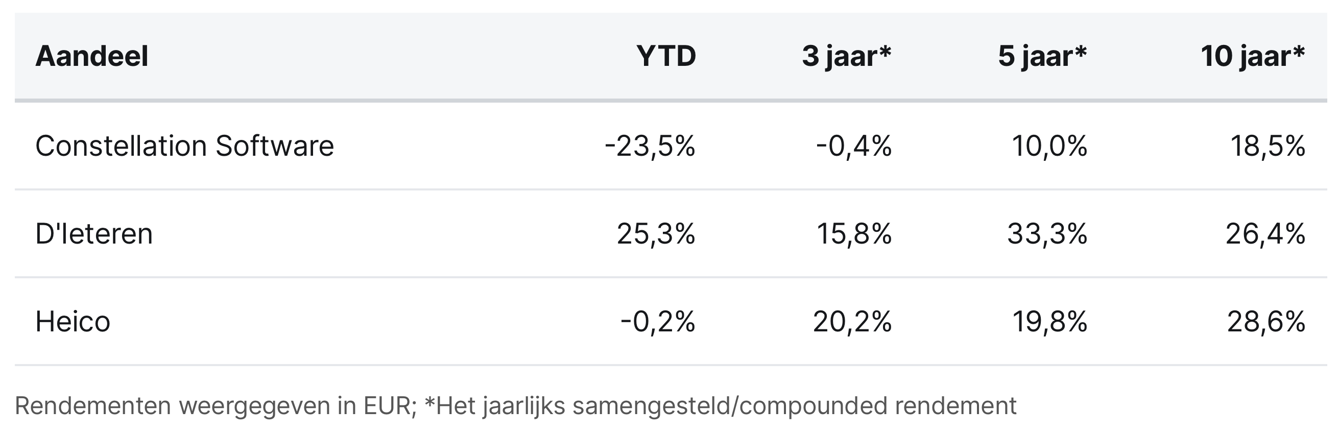 Constellation Software, D'Ieteren, and Heico are currently trading on the Toronto, Brussels, and New York stock exchanges at prices of CAD 2,548.50, EUR 192.90, and USD 253.05 per share, respectively.