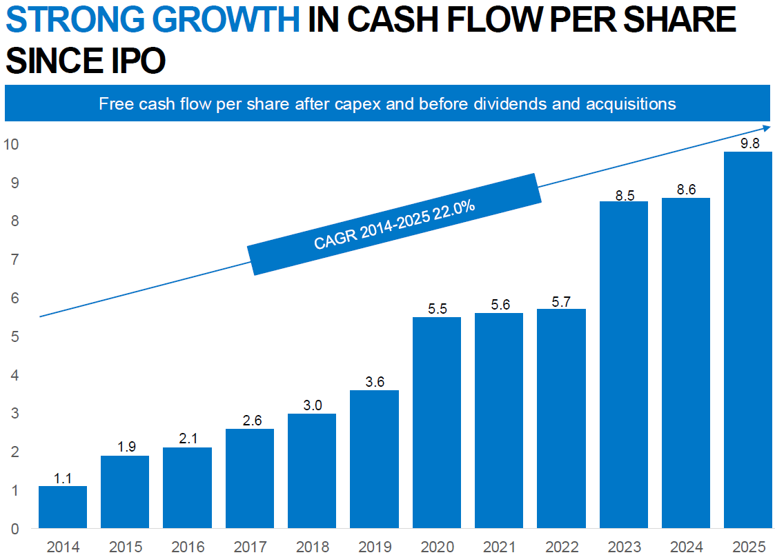 Management's primary focus is on growing free cash flow per share, which is seen as the ultimate measure of long-term value creation. Since the IPO in 2014, free cash flow per share has grown at a compound annual growth rate (CAGR) of 22%. This cash flow is available to pay dividends and is used to continue investing in new acquisitions. Operating cash flow increased by 22.8% to SEK 2 billion in the fourth quarter. This result is partly due to a strict focus on working capital management and the company's asset-light structure.