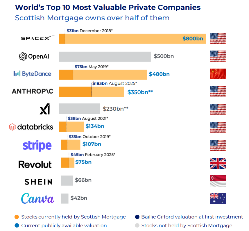 In a recent interview, manager Tom Slater emphasized SMT's unique position. The trust is invested in six of the ten largest private companies in the world, including heavyweights such as ByteDance, Anthropic, Databricks, Stripe, and Revolut.