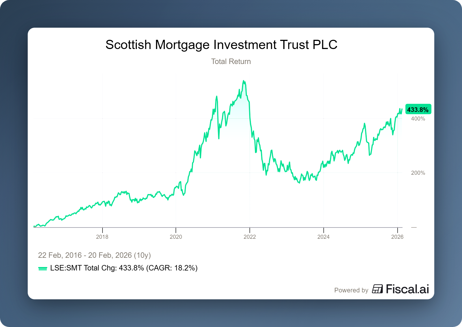 The British investment holding company Scottish Mortgage Investment Trust (London: SMT) recently published its figures for the fourth quarter of 2025. Over the whole of 2025, the trust's net asset value (NAV) rose by 22.3%, while its share price showed an even stronger increase of 24.7%. This meant that SMT significantly outperformed the broader market; the FTSE All-World Index remained stuck at a return of 14.6% over the same period.