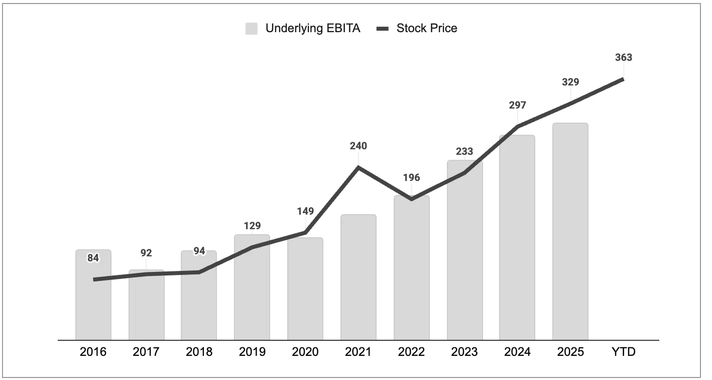 The figure above shows the underlying operating profit (bars) compared to the share price. This shows that fundamental developments are the most important driver of share price performance, followed by a modest reduction in the undervaluation relative to the net asset value. The undervaluation will have reduced further by 2026.