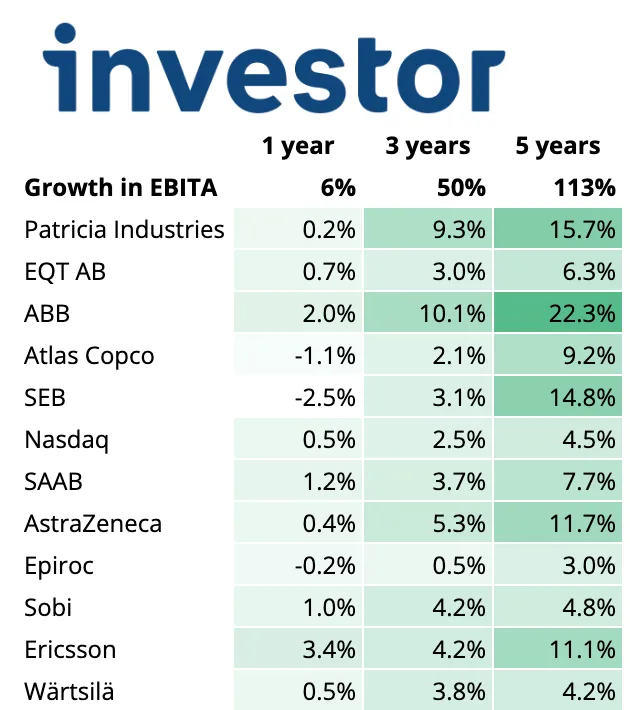 The figure below shows the absolute growth in operating profit over a period of 1, 3, and 5 years. Over a period of 5 years, EBITA (gross profit adjusted for amortization of intangible assets) rose by no less than 113%. The main contribution to this profit development came from automation and electrification company ABB, followed by the unlisted portfolio Patricia Industries and bank SEB.