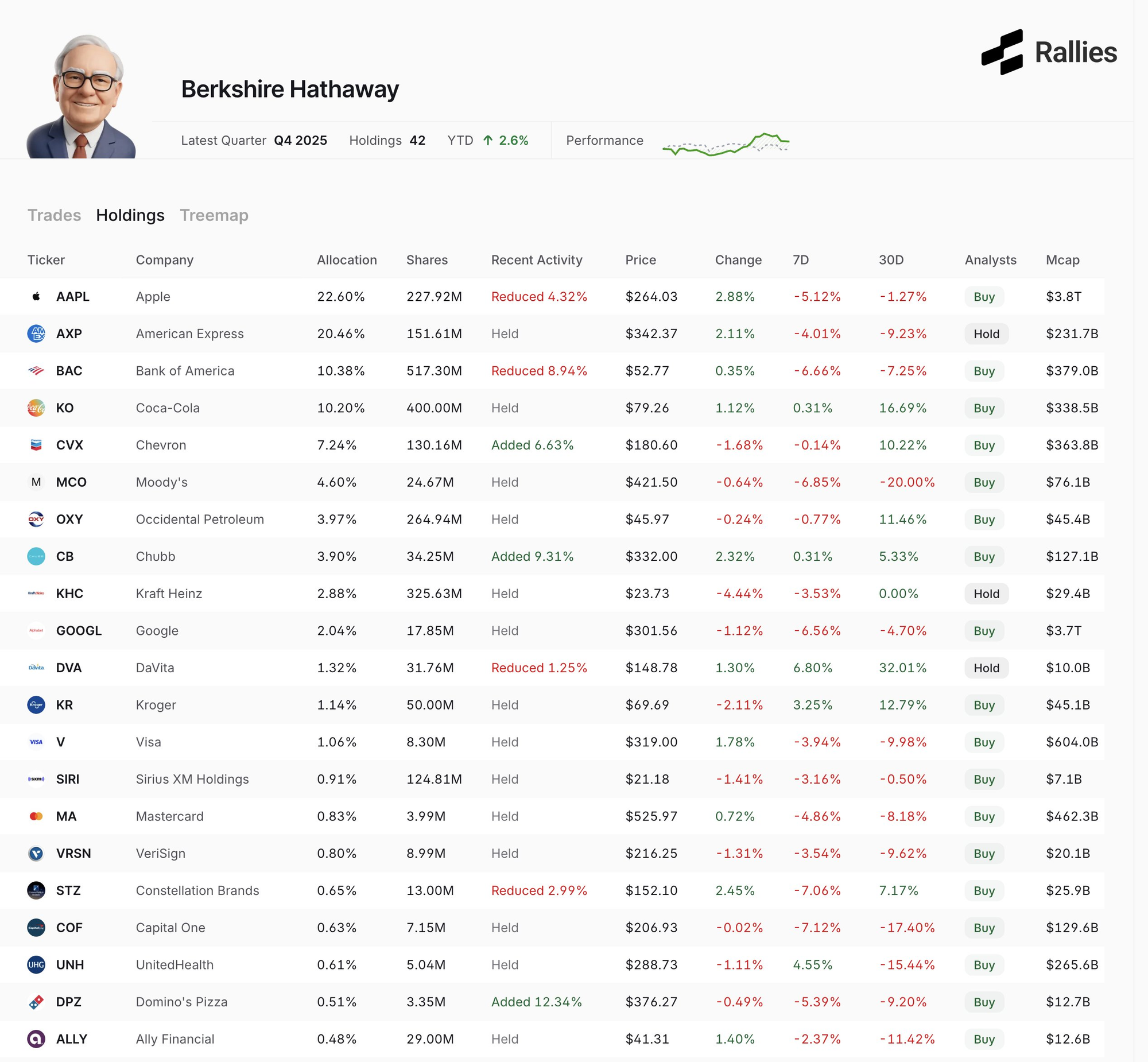 - Berkshire has again reduced its stake in the iPhone maker by 4.3%, bringing the position to a value of $61.96 billion. Although Apple remains by far the largest holding at around 22%, the trend is downward. After the sharp sell-offs in 2024 and the first half of 2025, Berkshire continues to steadily take profits.